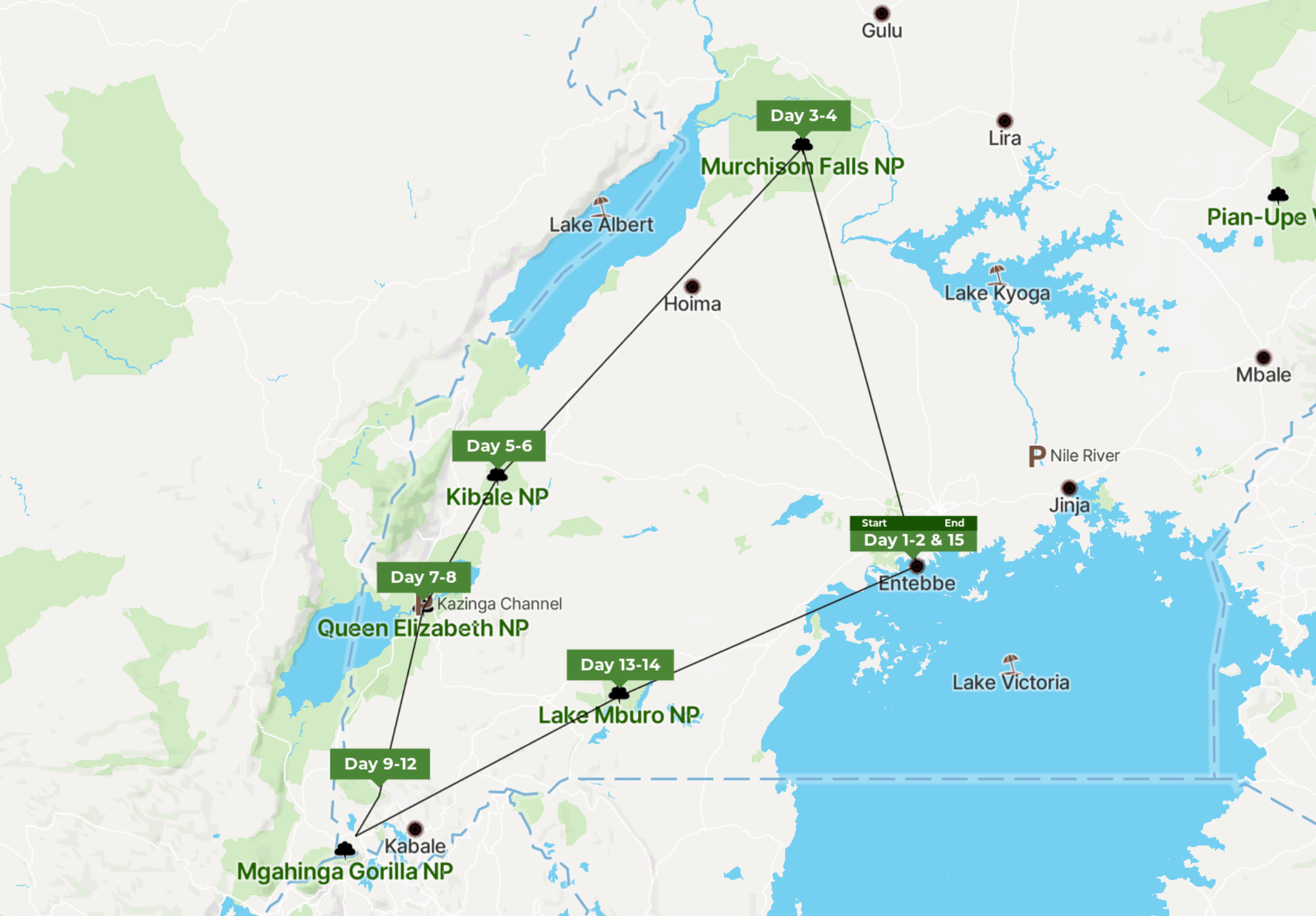 Na het ontbijt doen we een safari en gaan we op zoek naar onder andere olifanten, giraffen, leeuwen, buffels, luipaarden en meer. We verkennen hierbij de Buligi-route, de Albert-route, de Queen’s-route en de Nijl delta. Na de lunch doen we een boottocht op de Nijl waar we richting de voet van de Murchison-watervallen zullen varen. Hier wordt de Nijl door een smalle kloof geperst en vormt de bulderende Murchison-waterval. Dit is zonder twijfel de krachtigste waterval ter wereld. Tijdens deze boottocht heb je grote kans op het spotten van nijlpaarden, olifanten, krokodillen, buffels en antilopen. Daarnaast zijn er ook veel watervogels.